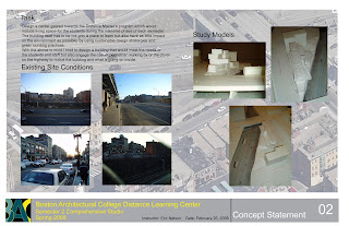 Ok, after talking to Eric I have revised my building to better relate to the site. The first floor is essentially unchanged. I feel that the way in which it is situated relates to both the Boylston Street and the Mass Turnpike, causing the building to squeeze down at the Mass Ave, Boylston intersection. The second floor is now aligned with the Mass Turnpike and now provides the the canopy over the front entry. The third floor is now aligned with Boylston Ave. I still have to work out the stairs and I need to work out the corner and some of the residual spaces that were created by the movement of the floors. Below are some views from around the building.